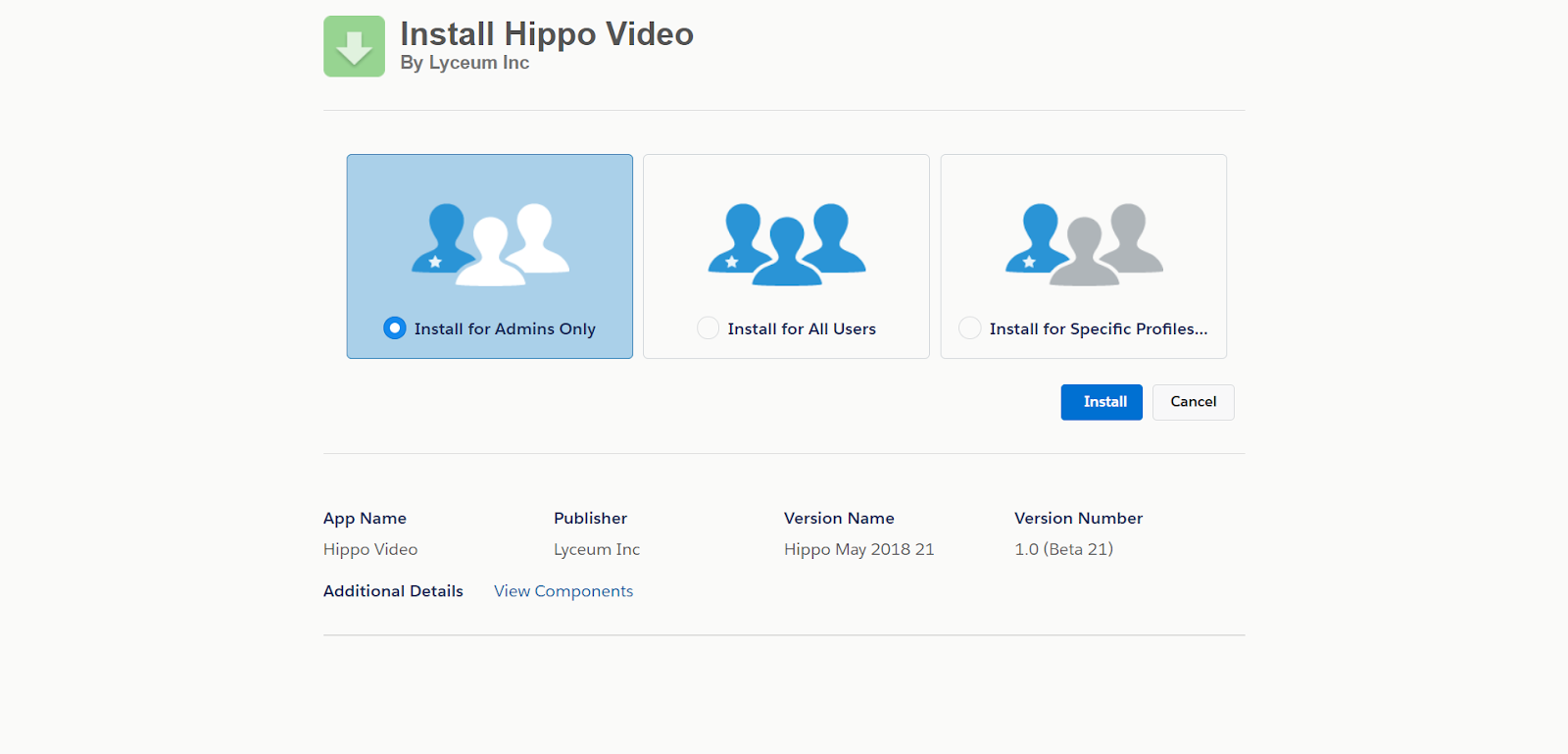 You can install Hippo Video for ‘Admins’, ‘All users’ or ‘Specific profiles’.