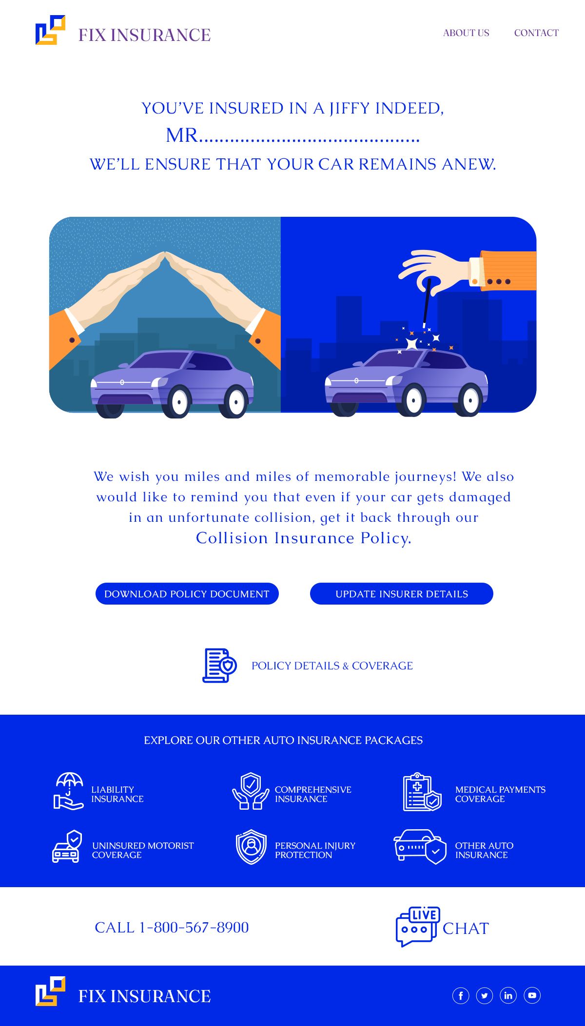 The landing page works both as an affirmation message and a marketing tool. You can include a customizable video across the page that lets them know about the details of collision coverage in their policy, along with inclusions, exclusions, FAQs, procedures, etc.
